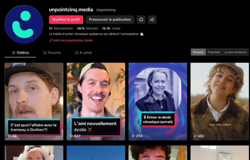 Unpointcinq, média qui fait du journalisme environnemental de solution, m’a d’abord mandaté de démarrer sa chaîne TikTok avec des capsules et reportages reflétant l’approche positive et constructive de la marque. Mes responsabilités étaient non seulement de réaliser les capsules, mais aussi de donner une direction générale à la chaîne.